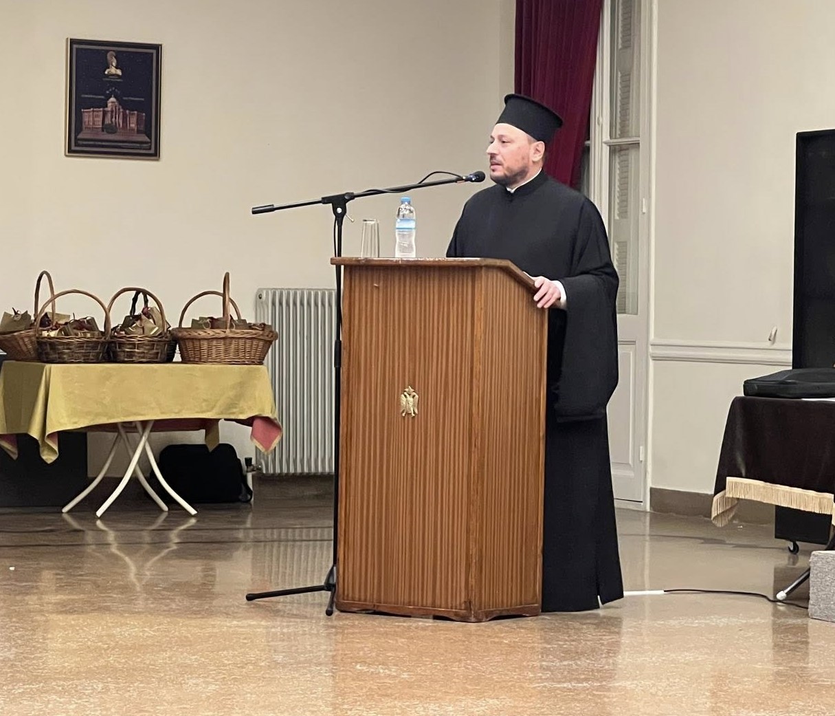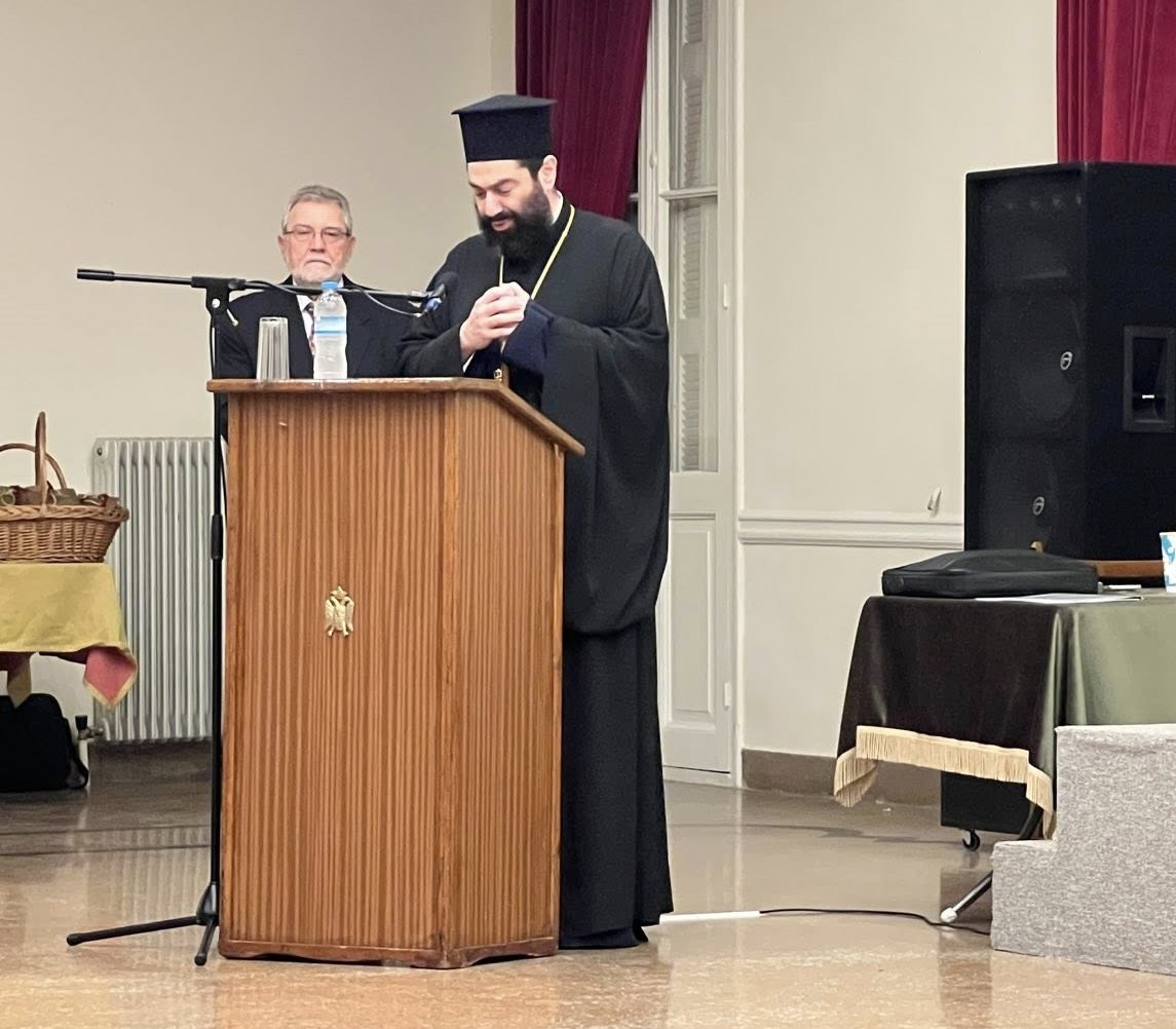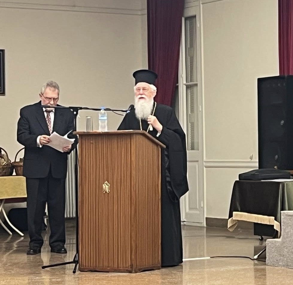 2. Ο Θεοφιλέστατος Επίσκοπος Ευρίπου κ. Χρυσόστομος Εκπρόσωπος του Μακαριωτάτου Αρχ. Αθηνών κ. Ιερωνύμου Β΄. Δίπλα του διακρίνεται ο συντονιστής της Διημερίδας κ. Στέφανος Κουμαρόπουλος.