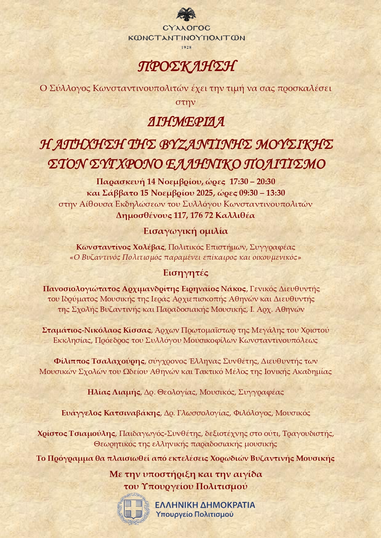 Παρασκευή 14 Νοεμβρίου, ώρες 17:30 – 20:30 και Σάββατο 15 Νοεμβρίου 2025, ώρες 09:30 – 13:30 στην Αίθουσα Εκδηλώσεων του Συλλόγου Κωνσταντινουπολιτών, Δημοσθένους 117, 176 72 Καλλιθέα.
