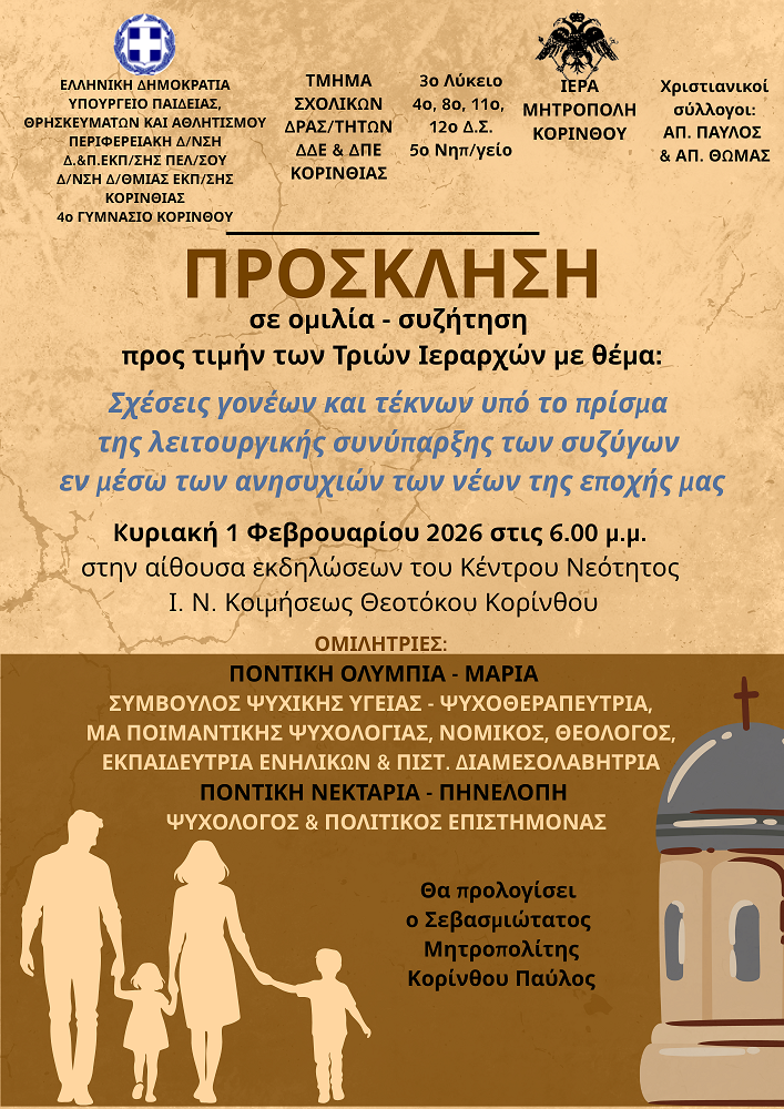 Ομιλία προς τιμήν των Τριών Ιεραρχών με θέμα: Σχέσεις Γονέων και Τέκνων υπό το πρίσμα της λειτουργικής συνύπαρξης των συζύγων εν μέσω των ανησυχιών των νέων της εποχής μας.